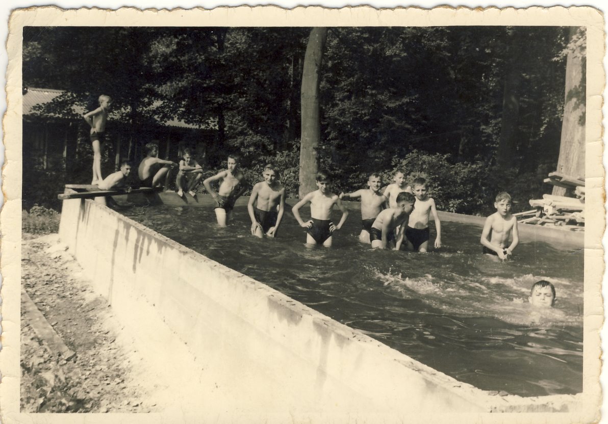 La piscine en construction en 1960. L'eau est froide parfois grouillante mais on s'y amuse. En juin, parfois même après le couvre feu !